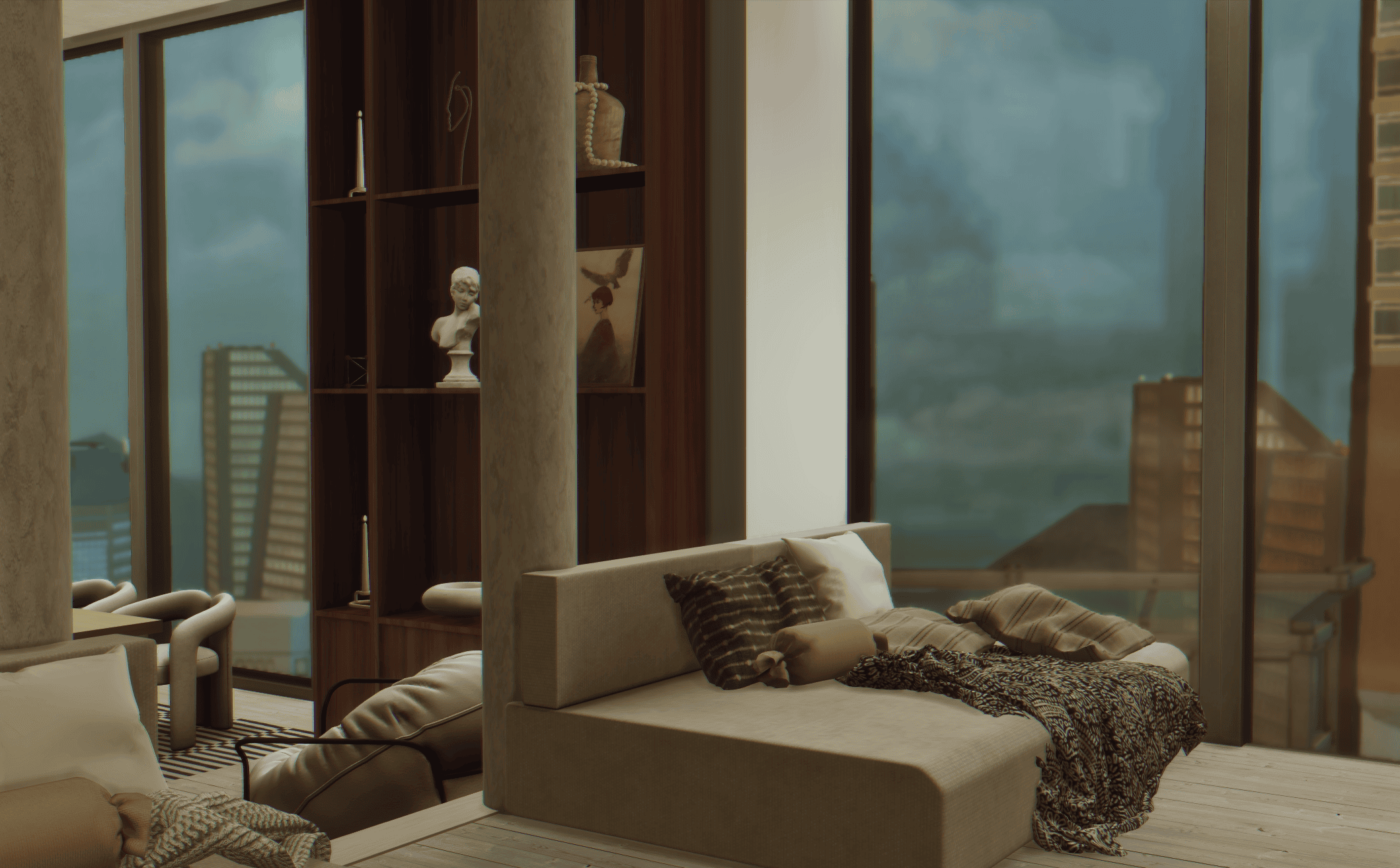 888 spire Apartment is a large 3 storey flat. It’s stylish, chic and modern and has a lot of bright colours. You can find a balcony, a kitchen, two dining areas, three living rooms, one is more a watching movies on a large flat screen the other both are more to relax with friends, enjoying the fire or read a book. One of these living rooms has also a bar. The apartment hast three bedrooms, one of these is a child room. The two other bedrooms have a bathroom next to it. One is very large with a sauna, big shower and a large bathtub. The apartment has also a fitness room and a large office area with a big piano in it.