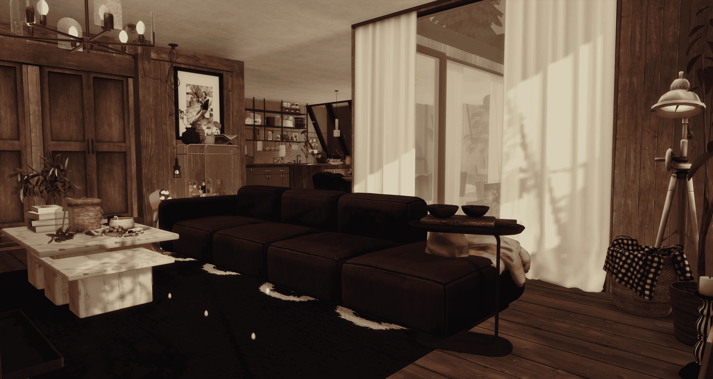 In time for the start of September, I built a building in an unusual architectural style and many large windows towards the rear of the building. The entire building is decorated in warm earthy tones and exudes autumn vibes. In the upper area there is an apartment with an open living and dining area, a baby room, a bedroom and an office. I have set up a creative co-working space in the lower part of the building. In which many independent designers and artists can work. I hope you enjoy it.
